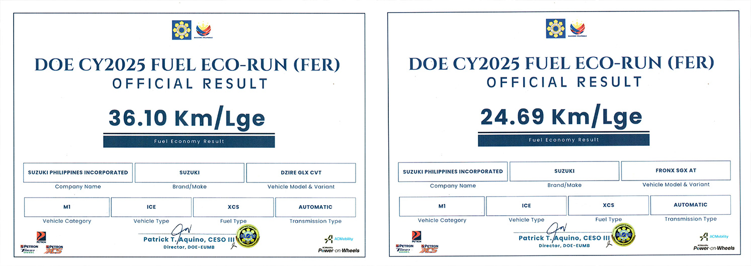 “These results affirm Suzuki’s philosophy of delivering practical and efficient vehicles that respond to real-world driving conditions,” said Mr. Norihide Takei, Director and General Manager of the Automobile Division of Suzuki Philippines Incorporated. “The DOE Fuel Eco-Run is an important platform that objectively measures fuel efficiency, and we are proud that both the Dzire Hybrid and the Fronx Hybrid demonstrated strong performance under standardized testing.”