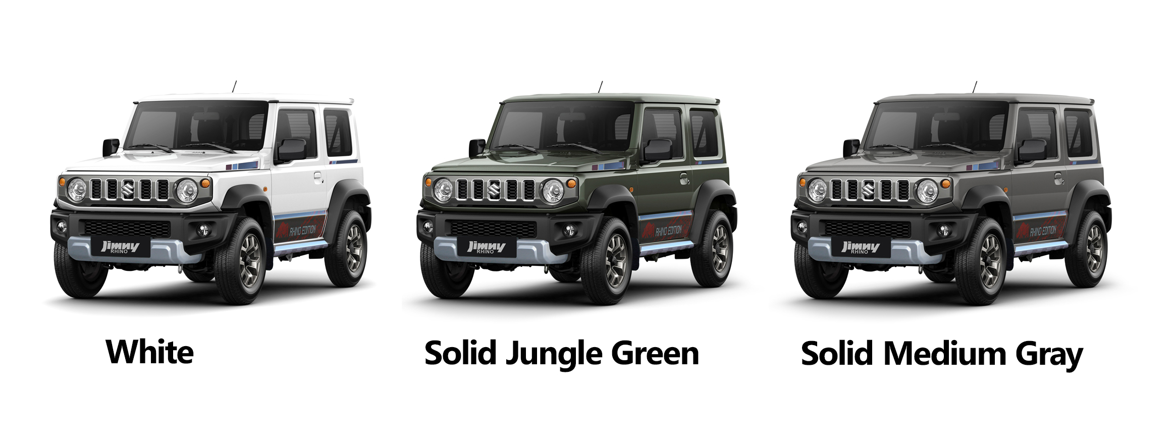 The Jimny 3-Door Rhino Edition will hit Suzuki dealerships nationwide starting the 4th week of November 2024. Available in three exciting colors: White, Solid Jungle Green and Solid Medium Gray, the Jimny Rhino Edition is sure to capture the hearts of off-road enthusiasts and style-savvy adventurers alike.