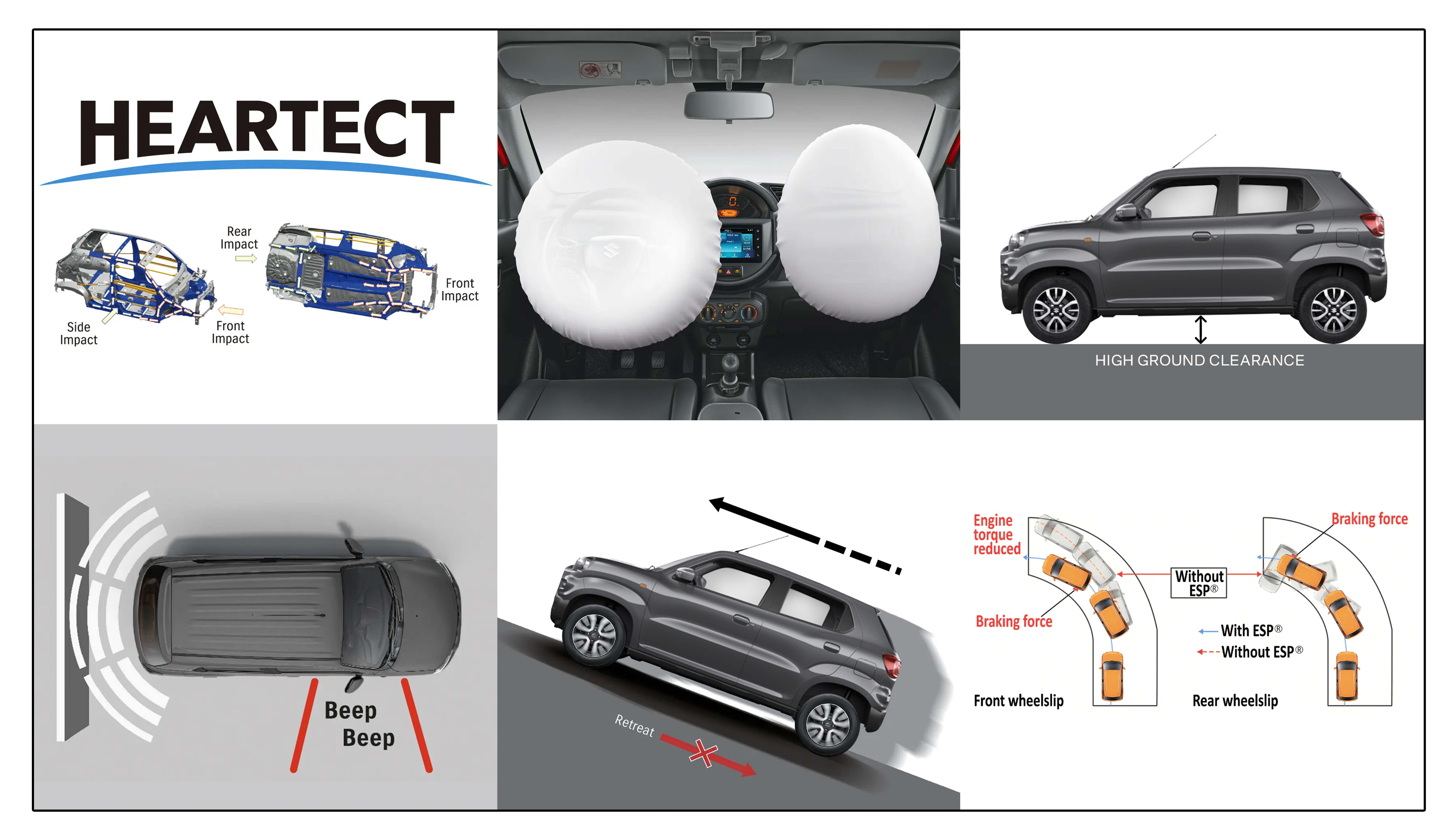 The S-Presso is built with Suzuki’s HEARTECT platform. The body design of the S-Presso centers on Suzuki’s TECT concept, which helps protect the cabin structure absorb and disperse impact energy in case of a collision. This robust construction minimizes the risk of injury to occupants by reinforcing critical areas of the car’s frame, ensuring that the cabin remains intact during an accident.